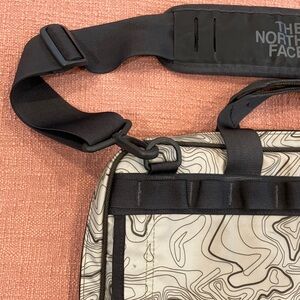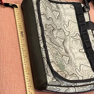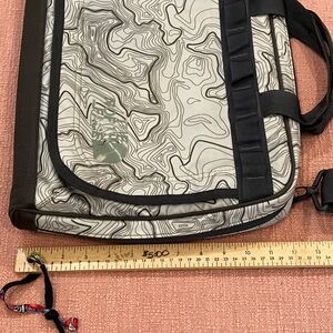 AI description Stylish laptop bag with topographic design. Durable black straps. Secure zip closure. Ideal for daily use.
