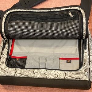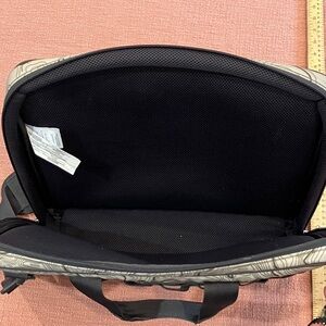 Good used condition, waterproof outer layer, padded laptop pouch, accessories pouch, adjustable shoulder harness and handles.