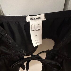 Chic black cami top. Features lace trim and tie front. Perfect for layering.