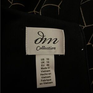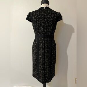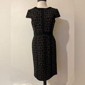Chic black midi dress with tan geometric pattern. Perfect for stylish occasions. Women’s size 10. Good preowned condition