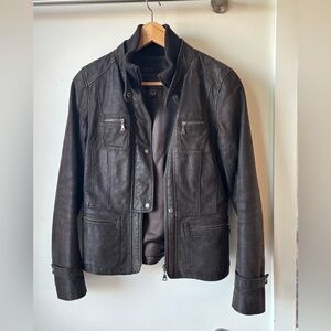 Thanks for stopping by and having a look! This is a really great, Danier moto jacket. Beautiful rich, chocolate brown color with a bit of a distressed look. Genuine leather. Has a fully removable, Thinsulate lining, so can be worn in multiple seasons. In EUC - no marks or flaws - just some light pilling on the knit collar and very minor wear common for pre-loved leather. Please see pics for measurements (if you need more, please message me). From a smoke-free, pet-free home. All reasonable offers considered!