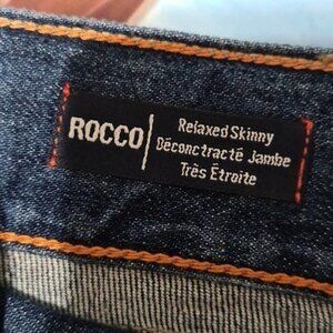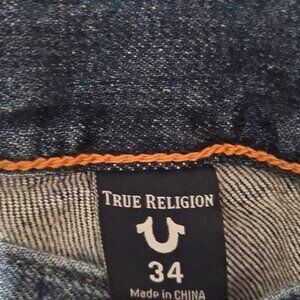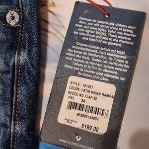 The product is a pair of True Religion Rocco Skinny Distressed Jeans in size 34. These jeans feature a solid blue color, zip closure, denim fabric, and a 5-pocket design with a skinny style. The distressed detailing adds a unique accent to the garment. Suitable for all seasons, these regular fit jeans are machine washable and branded with the True Religion logo. Perfect for men who appreciate quality and style in their clothing.