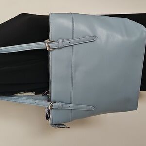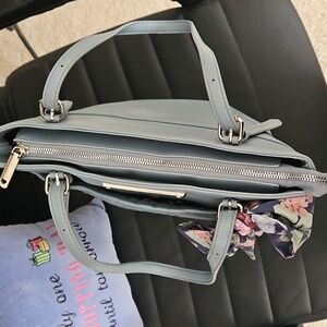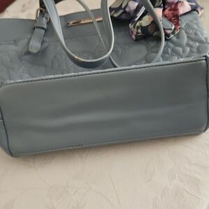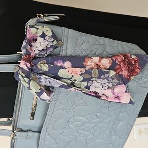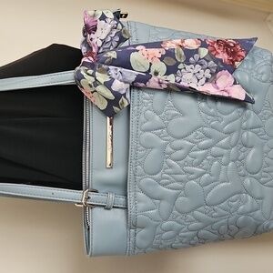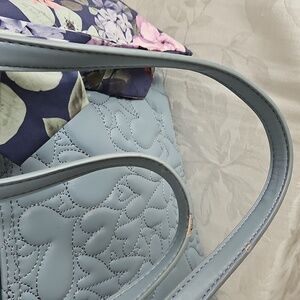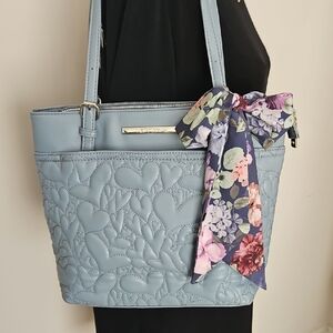 Betsey Johnson Blue Quilted Heart Shopper Tote with a floral scarf. This specific style is also sometimes referred to as the "XO Aaliya Shopper" model.