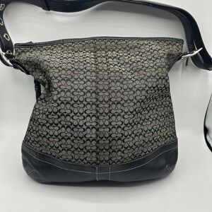 The Vintage Y2K Coach F10416 Signature Convertible Duffle Crossbody Bag in Gray Black is a stylish and versatile accessory for women. Featuring a zip closure and adjustable strap, this bag is perfect for travel, casual outings, or workwear. Made with a combination of Jacquard canvas and black leather, the exterior showcases the iconic Coach Signature C logo while the interior is lined with black fabric. With silver tone hardware accents, this duffle crossbody bag exudes a timeless charm with a modern twist, making it a must-have addition to any wardrobe.