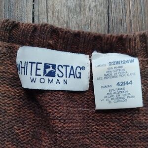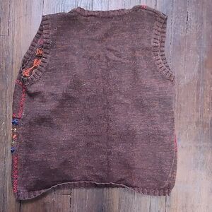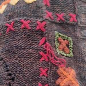 Rich brown cardigan with vibrant patterns. Button-up style. Ideal for layering.