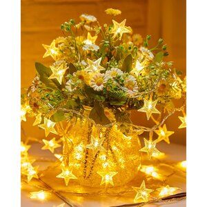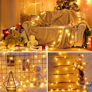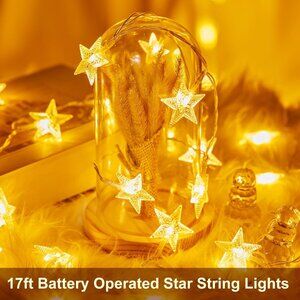 Battery Star String Lights - Powered by 3 AA batteries , the star fairy string lights are 17 feet long with 50 bright LEDs. The thin clear wiring and lovey star-shaped LED bulbs will add a delicate and romantic touch to your personal space. Each star bulb is about 1.3 inches wide with durable, waterproof plastic construction