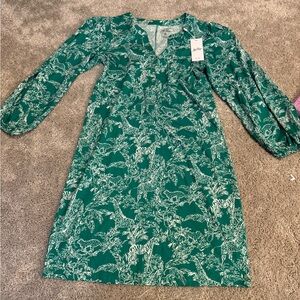 Vibrant green dress with intricate white jungle pattern. Long sleeves add elegance. Ideal for versatile wear.