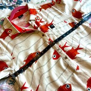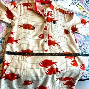 Stylish shirt dress with a vibrant fish print. Features a button-up front and short sleeves. Perfect for casual outings. Dress Size S with loose fitting so it will fit M size too.