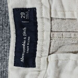 Abercrombie & Fitch Linen Blend Shorts in a light cream/khaki color. Features a tailored fit and lovely textured material. Classic piece that works well for a spring day out with friends or even summer brunch with friends. The perfect multi season closet staple shorts.