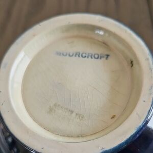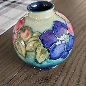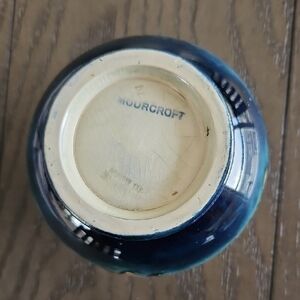 This is a "Walter Moorcroft" pottery vase. The details and colors are gorgeous. This small vase stands 4.4" T and 13" in circumference. There is crazing, which is common with this pottery. There is a very small flea bite near the lip of the vase. It's hard to see. It is stamped on the bottom. Refer to photos.