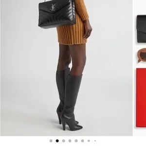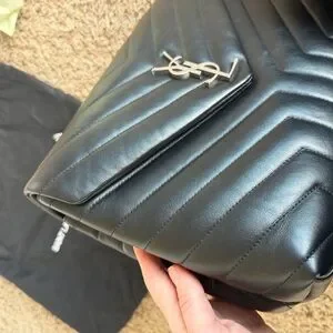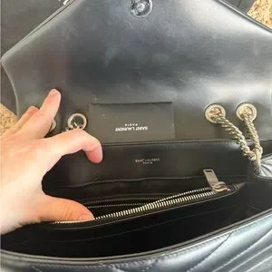 Sophisticated black leather with chevron pattern. Elegant silver chain strap. Iconic YSL logo detail.