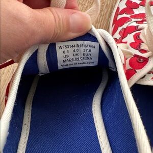 Kate Spade x Keds red butterfly print canvas sneakers, size 6.5. Worn once and in very clean condition. Cute, playful collab with an all-over butterfly design—perfect for spring and Valentine’s outfits. Sold-out style.