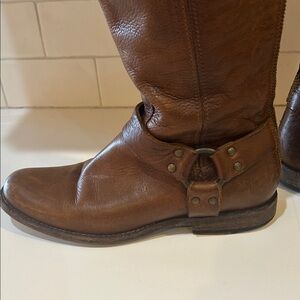 Stylish Frye heeled boots. Rich brown leather. Knee-high design. Perfect for any occasion.