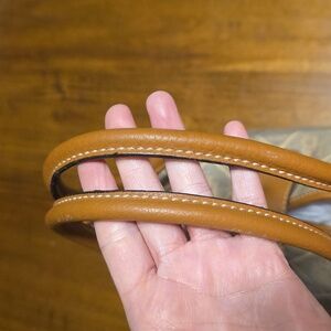 Color: The canvas appears to be a khaki or beige/brown shade, with tan or brown leather accents.