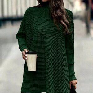 Dark Green Casual Women's Turtleneck Batwing Sleeve Poncho Sweater top