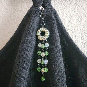 Features unique jeweled hardware with green and iridescent beaded fringe at neckline