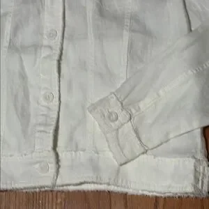 Stylish white linen jacket with frayed edges. Features buttoned front, buttoned chest pockets, side slit pockets. Perfect for summer!