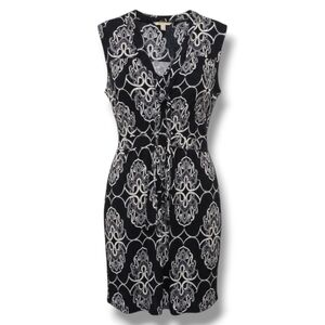 Beautiful Banana Republic women’s sleeveless navy abstract print dress featuring a tie-neck front, pullover design, soft stretch polyester-spandex blend, and a 36" dress length. Gently used and in great condition. Size Small.
