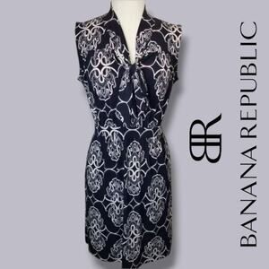 banana republic, womens dress, navy dress, abstract print, sleeveless dress, tie neck dress, stretch dress, casual dress, office wear, summer dress, size small, classy style