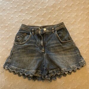 Stylish denim shorts with a playful ruffle hem. Perfect for casual outings. Classic blue color for versatile styling.