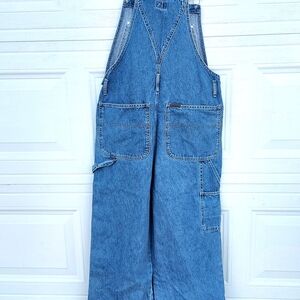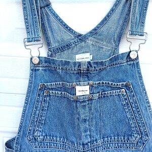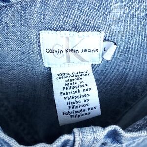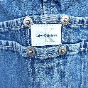 The product is a vintage pair of 90s Y2K Calvin Klein Bib Overalls in size Large. These overalls feature a straight leg style with a baggy fit and are made of cotton material in a classic blue color. The set includes leggings and has a theme inspired by the 90s era, making it a unique and stylish addition to any woman's wardrobe. With the iconic Calvin Klein brand, these overalls offer a trendy and nostalgic fashion statement for those looking to embrace retro style. excellent condition, no rips or stains, years of life left in this quality denim.