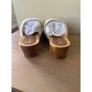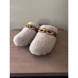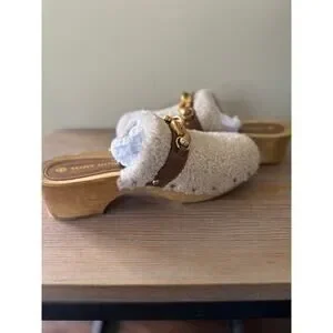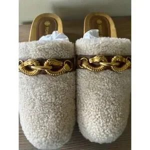 Tory Burch Shearling Clogs Women’s Size 9 Jessa Mules Tan Beige Gold Chain Shoes