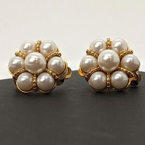 Elevate your vintage style with these beautiful unsigned Erwin Pearl clip-on earrings. These exquisite pieces feature a stunning cluster design of luminous faux pearls, arranged to create a timeless and elegant floral-like motif.
