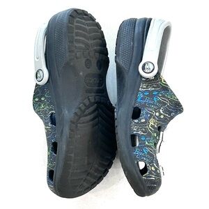 Fun Star Wars crocs with black, blue, and green design. Comfortable and stylish for young fans.