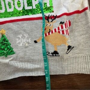 Cheerful Christmas Holiday sweater with Santa and reindeer. Includes snowflakes and a Christmas tree. Ideal for festive occasions.