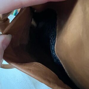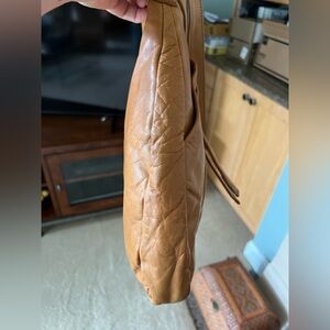 Stylish tan leather backpack featuring a bow detail. Perfect for everyday use.