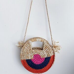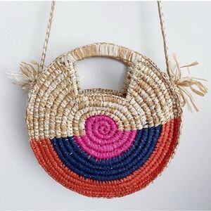 -Vibrant color blocking gives vacation-ready charm to this swirling straw tote.