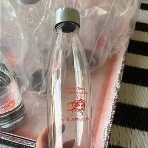 ( WHT)White Horse Thunder bottled water with silver caps. 12 Plastic Clear bottles with orange Thee Golden Tiger Art by Julie Lee Nersinger.