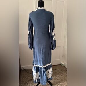 Elegant long sleeve dress by FARM Rio. Features bold floral patterns. Deep V-neckline. Perfect for any occasion.