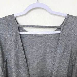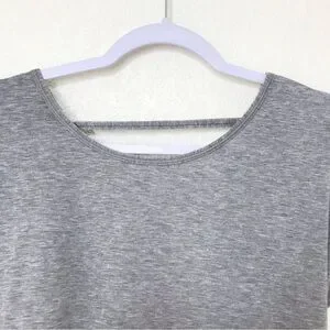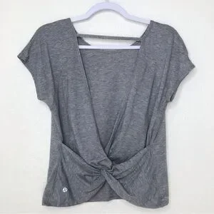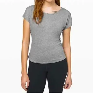 Super soft training tee from Lululemon. The Twist Back Tee in Heathered Core Medium Gray. Open back design with a gently twisted back design. Draped effect. Short sleeves. Hip length. Stretch fabric. Anti-stink. Sweat wicking. Quick dry. Silverescent technology. No size tag - fits like a 6 - see Measurements. Underarm to Underarm - 18”; Length - 20 1/2”. All measurements approximate. Excellent pre-owned condition.