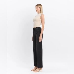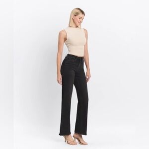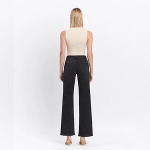 Comfort stretch denim, high rise waist, finished hem, full length, loose fit wide leg jeans.