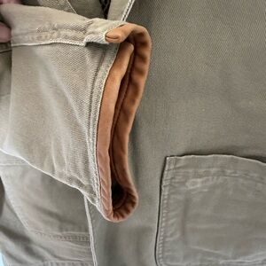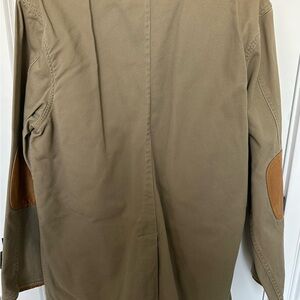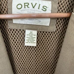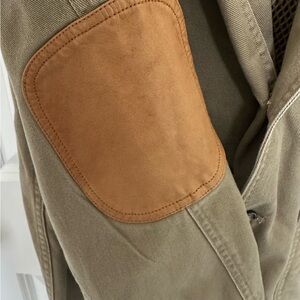 Durable Orvis field jacket. Khaki with brown Leather accents. Ideal for outdoor adventures.