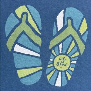 coastal casual, beach inspired graphic tee, flip flop graphic shirt, laid back lifestyle wear, casual womens top, vacation ready outfit, summer essentials, everyday cotton tee, relaxed weekend style, beach town aesthetic, soft washed cotton shirt, classic American casual, travel inspired clothing, feel good fashion, LIFE IS GOOD womens tee