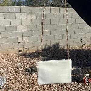 Chic Salvatore Ferragamo clutch in ivory. Features a stylish gold accent. Perfect for elevating any outfit.