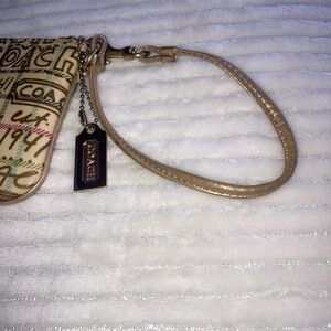 Chic Coach wristlet with signature multicolor pattern. Ideal for essentials on the go.