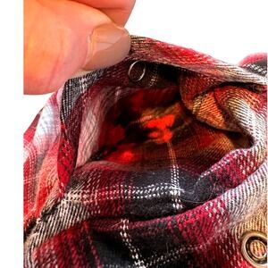Legendary Whitetails red and black plaid Backwoods Hooded Flannel Shirt; men's size medium. Overall very good condition, but please note that something that was a hot neon pink color was left in the right chest pocket and washed. See last two photos - you really cannot see anything from the outside, but when you look inside the pocket, there is hot pink residue and the fabric is a bit stiff over these areas. This is NOT visible when worn!!