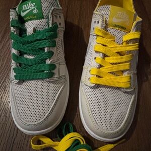 Vibrant Nike dunk shoes with a yellow and green design. Exclusive Ishod Wair mismatch. Listed on Stock X going for up to $700. Men’s size 4.5 which equals Women’s size 6 ! Purchased on stock X verified authenticity wore one time for 5 minutes they are too small for me so still like brand new no scuffs, no creasing !! Comes with extra laces