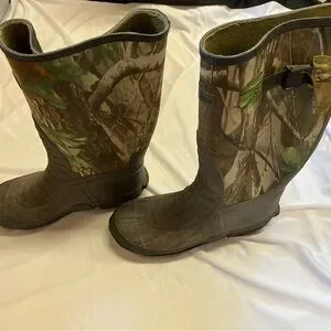 Rugged camo boots with steel shank. Perfect for tough terrains. Tall rubber for outdoor and work activities. Good used condition.