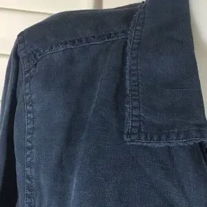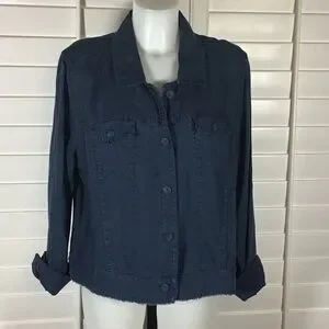 Lightweight navy blue linen jacket. Button front, cuffs and pockets. Raw edge trim. Measures approx 24” to hem, across bust front 24”. Excellent condition. Size XL