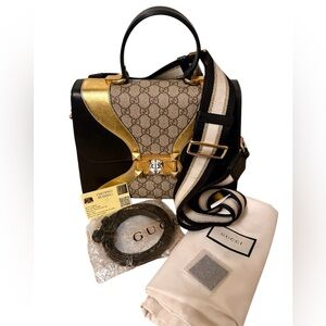 This elegant Gucci Osiride medium handbag features a stunning gold and black leather combination accented with GG supreme coated canvas. Can be carried top handle, shoulder or crossbody (original Gucci black leather strap - still new in packaging - and coordinating Marc Jacobs guitar strap included). Pre-loved - Gold leather has light fading in spots and a couple marks on leather and interior. Please see photos as they detail condition. Stunning bag. People ALWAYS stop me to comment on it when carrying. Includes authenticity certification (COA) and Gucci dust bag.