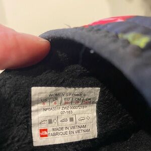 Colorful floral slippers by The North Face. Easy slip-on design. The bottoms are hard — great for camping or indoor/outdoor use