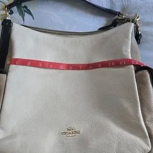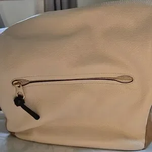 Beautiful authentic COACH Pebble bag in rich colorblocked pebbled leather, tan front and back, taupe sides, brown pocket flaps and shoulder strap. Gleaming gold domed logo snaps at the exterior side pockets. Top zip closure. Spacious interior is fully lined with a zip pocket. Leather Coach creed label. Gold metal Coach logo in front. Back zip pocket. Two straps one adjustable. In excellent pre-owned condition! Very desirable and functional bag! Measurements in the photos.