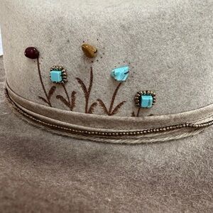 Features a dipped crown, layered ribbon band, subtle ombré coloration, and stone-adorned floral stitching along the side. Fully lined interior for comfort.