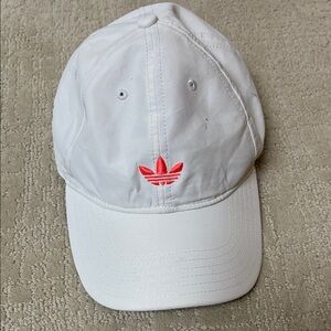 Classic white Adidas hat with adjustable strap. Features bold pink emblem. Ideal for casual outings. Good preowned condition with some minor signs of wear