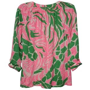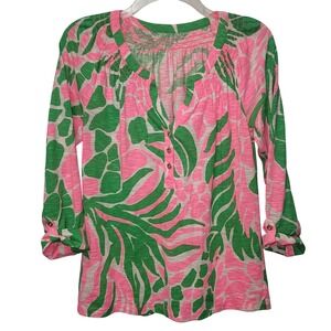 Bring the sunshine with this eye-catching Lilly Pulitzer long-sleeve blouse, featuring a lush tropical print in pink and green on a soft white base. The gathered smocked neckline and partial button placket add a touch of boho charm, while the roll-tab sleeves offer styling flexibility. Lightweight and breezy—perfect for resort wear, brunch dates, or casual Fridays.