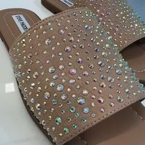 Steve Madden slide sandals featuring a wide strap with iridescent rhinestone embellishments. Neutral tan/nude base makes them easy to dress up or down — perfect for summer, vacation, or casual chic looks.